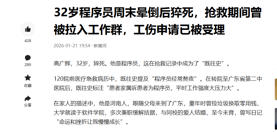 今天,一则关于同行的新闻让我在屏幕前沉默许久——《32岁程序员周末晕倒后猝死》。