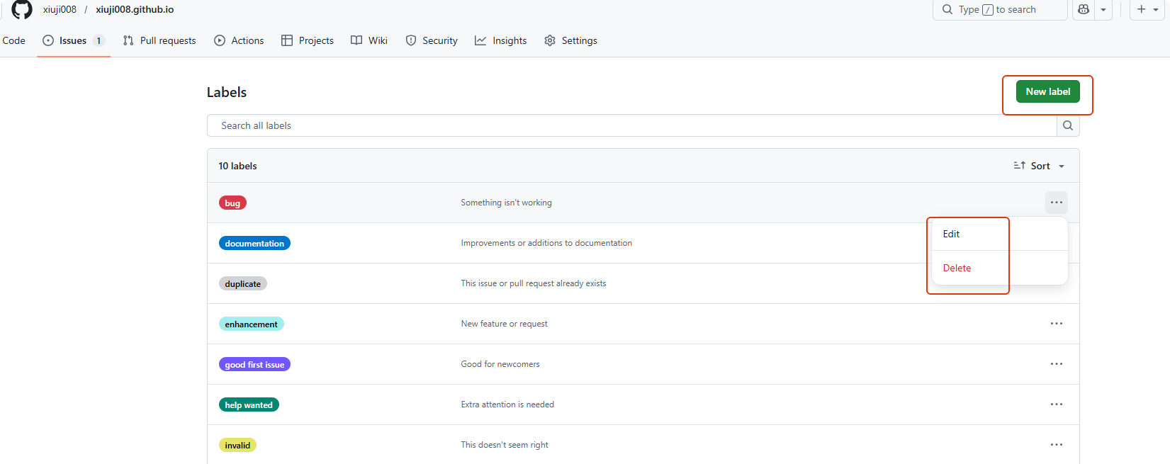 issue页签, 点击右侧Labels后边的设置按钮,点击Edit labels